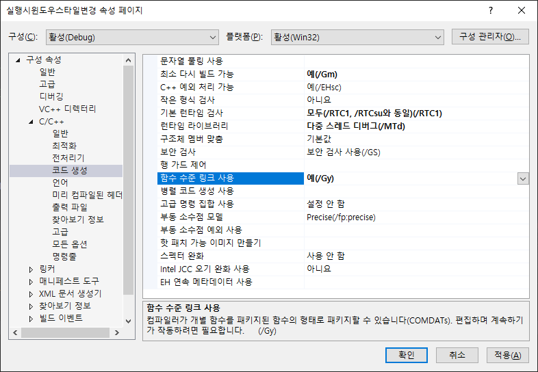project 속성 - 구성속성 - C/C++ - 코드생성 - 함수 수준 링크 사용 좌측의 값 변경(예(/Gy))