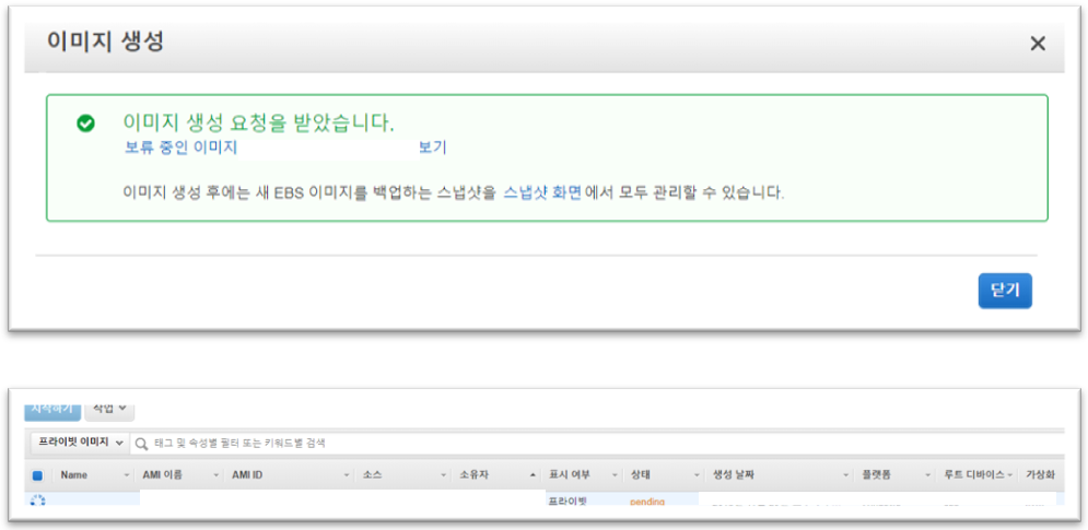위와 같은 창이 팝업 하며, 이미지가 생성된다. 진행사항은 좌측 이미지 카테고리 - AMI에서 확인 가능하다.(이미지 생성 중일 때 상태값이 pending 이며, 생성이 완료되면 available 으로 표시된다.