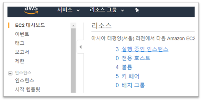 리소스 – 실행중인 인스턴스 클릭(현재 등록한 인스턴스를 확인할 수 있다.)